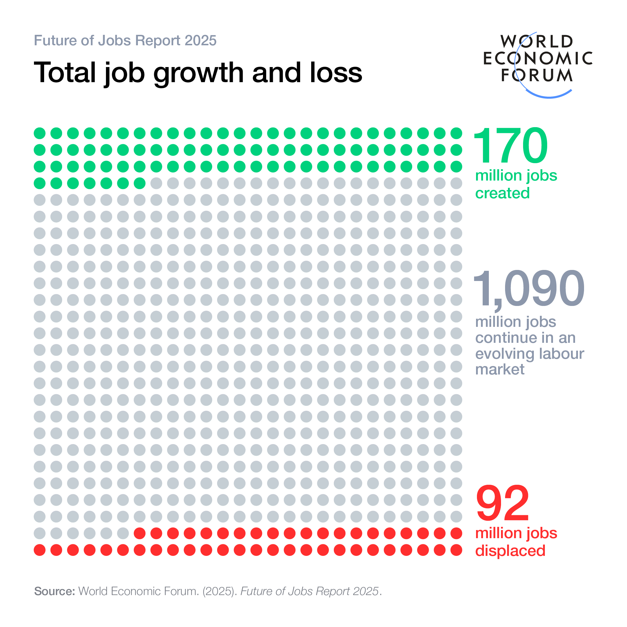 The interplay of these macrotrends is expected to result in a "structural labor market churn" of 22% of jobs, with 170 million new jobs created and 92 million displaced by 2030. While this represents a net increase of 78 million jobs, the changes will not be evenly distributed. Technological change is predicted to be the most divergent force, both creating and displacing jobs.
